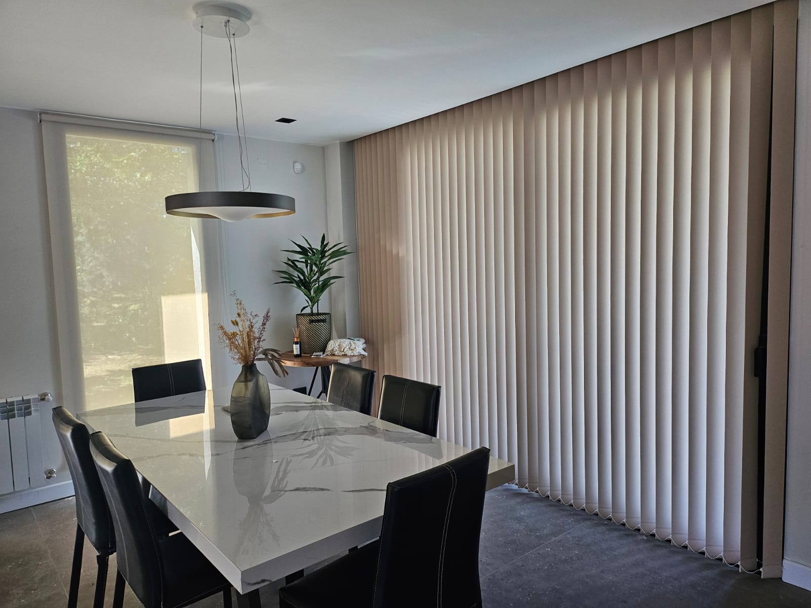 Gracias a su estructura vertical, estas cortinas son ideales para grandes ventanales o aberturas corredizas, aportando un efecto visual de amplitud, orden y sofisticación. Su tela translúcida filtra suavemente los rayos solares, manteniendo el ambiente confortable y moderno durante todo el día.